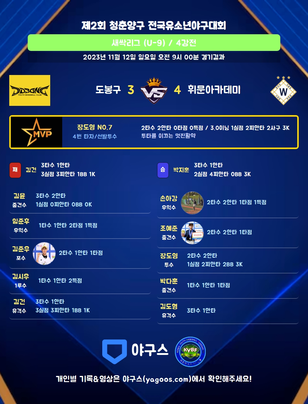 | 3 | 포 | 김준우(18) | 사구 | - | 우전안 | - | 3땅 | 2 | 1 | 1 | 0 | 0 | 0 | 1 | 0 | 0.500 |