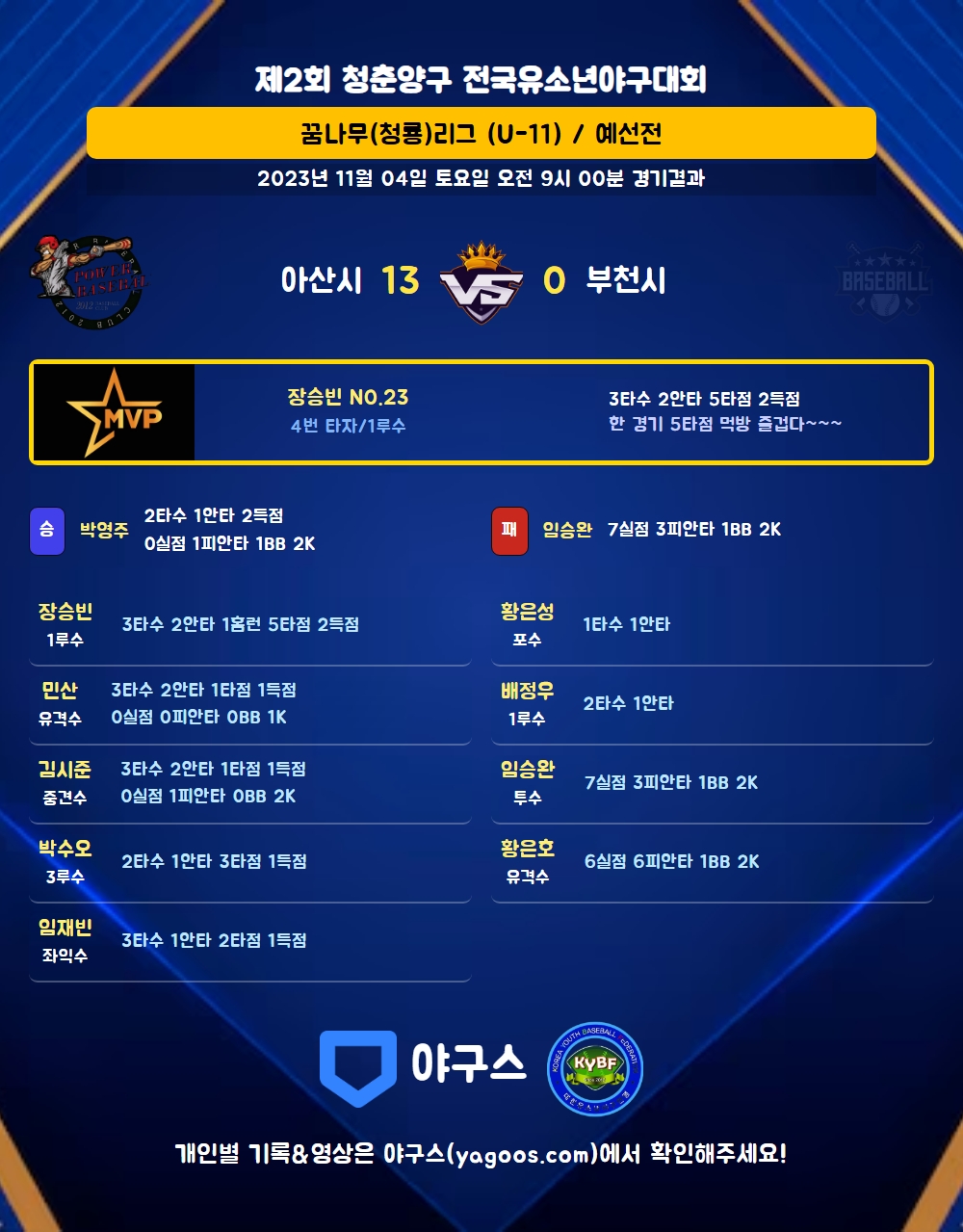 | 3 | 투 | 임승완(2) | 사구 | - | 삼진 | 1 | 0 | 0 | 0 | 0 | 0 | 1 | 1 | 0.000 |