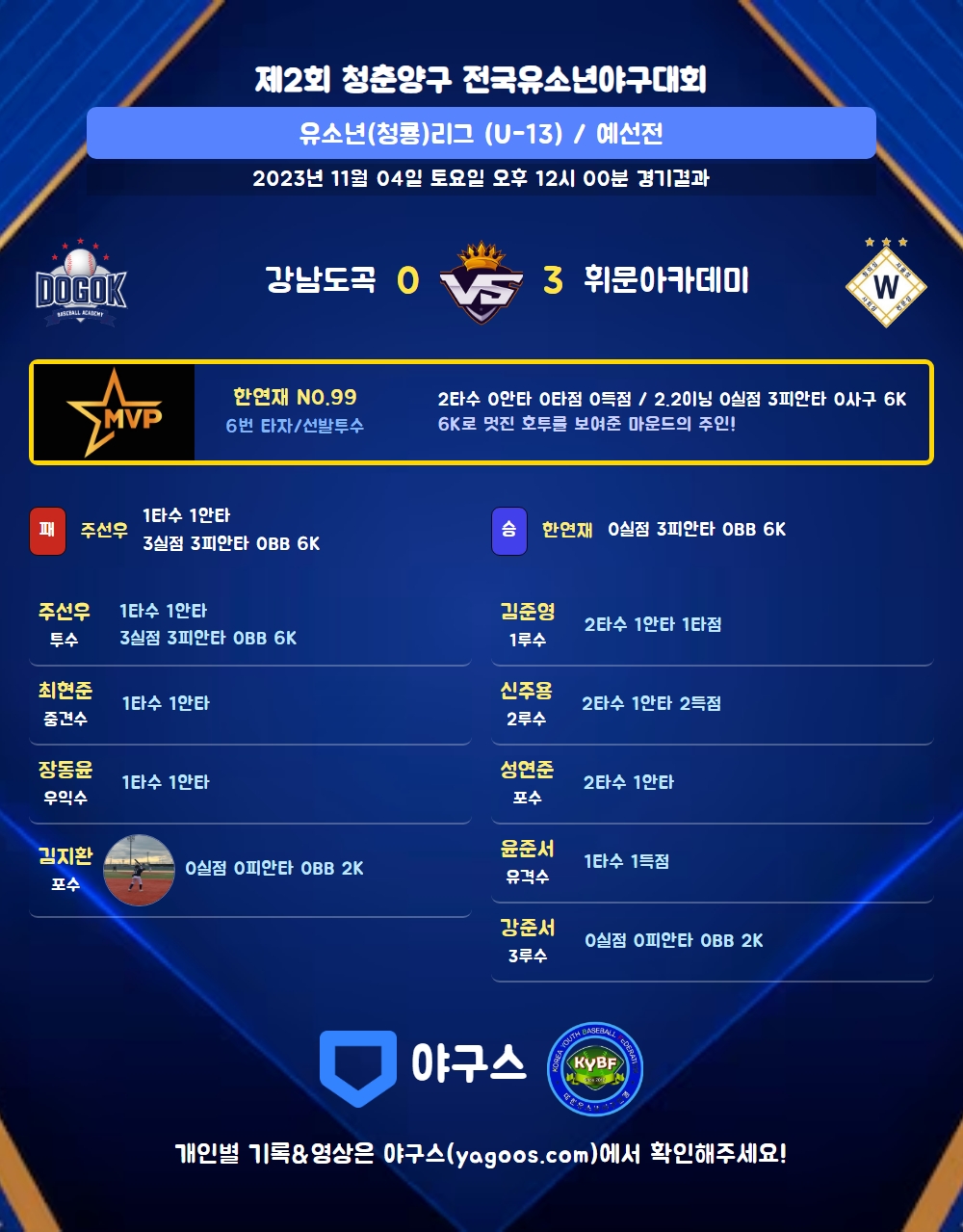 | 2 | 강준서(23) | 세이브 | - | 4 | 0 | 0 | 0 | 1 | 2 | 24 | 0 | 0 | 0 |