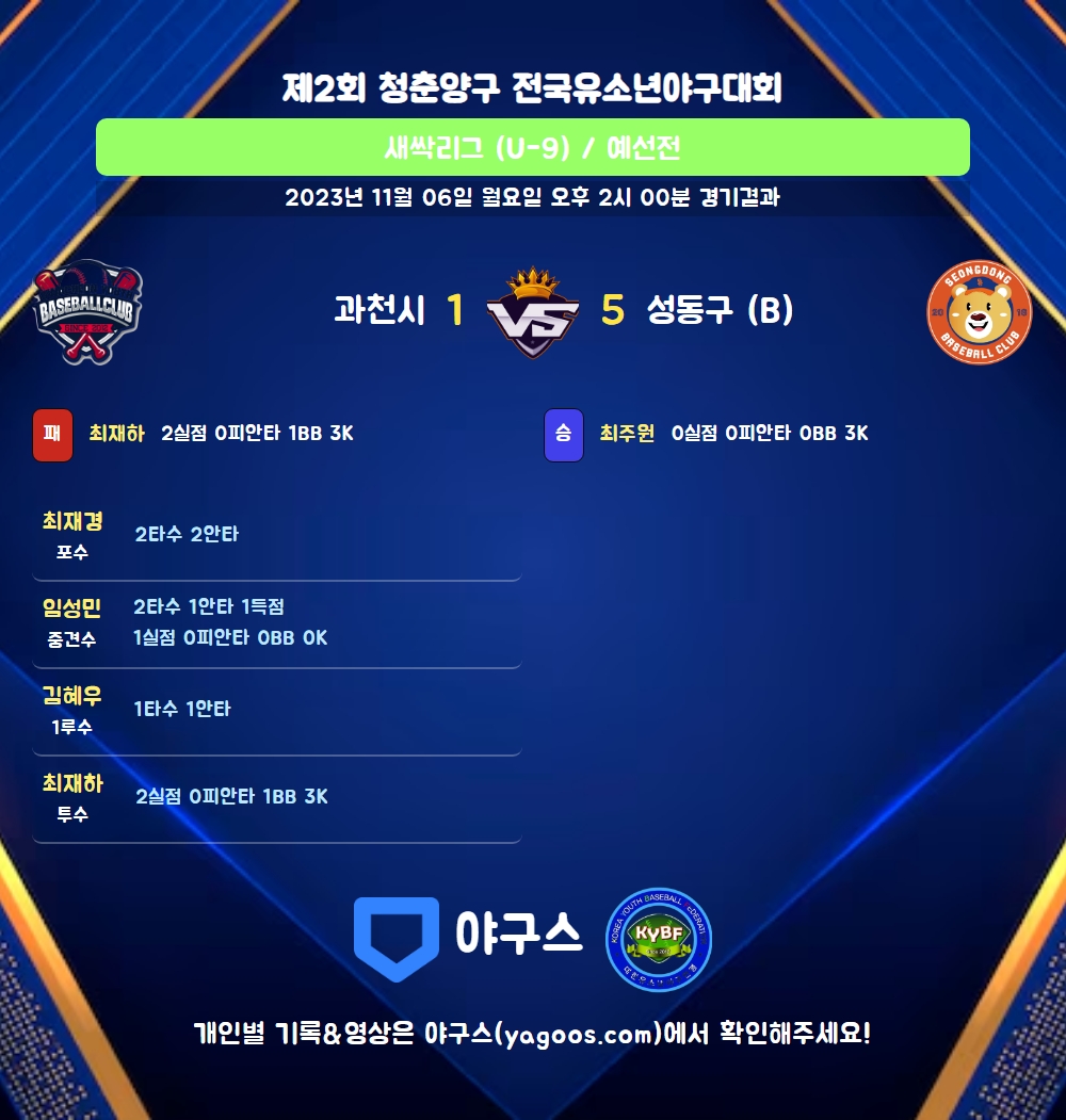 | 1 | 최재하(5) | 패 | - | 8 | 0 | 0 | 0 | 5 | 3 | 43 | 2 | 2 | 0 |