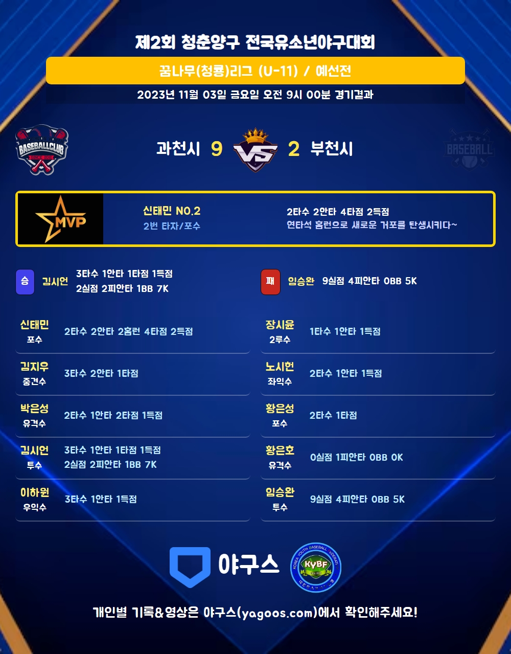 | 3 | 투 | 임승완(2) | 사구 | 삼진 | - | - | 1 | 0 | 0 | 0 | 0 | 1 | 1 | 1 | 0.000 |