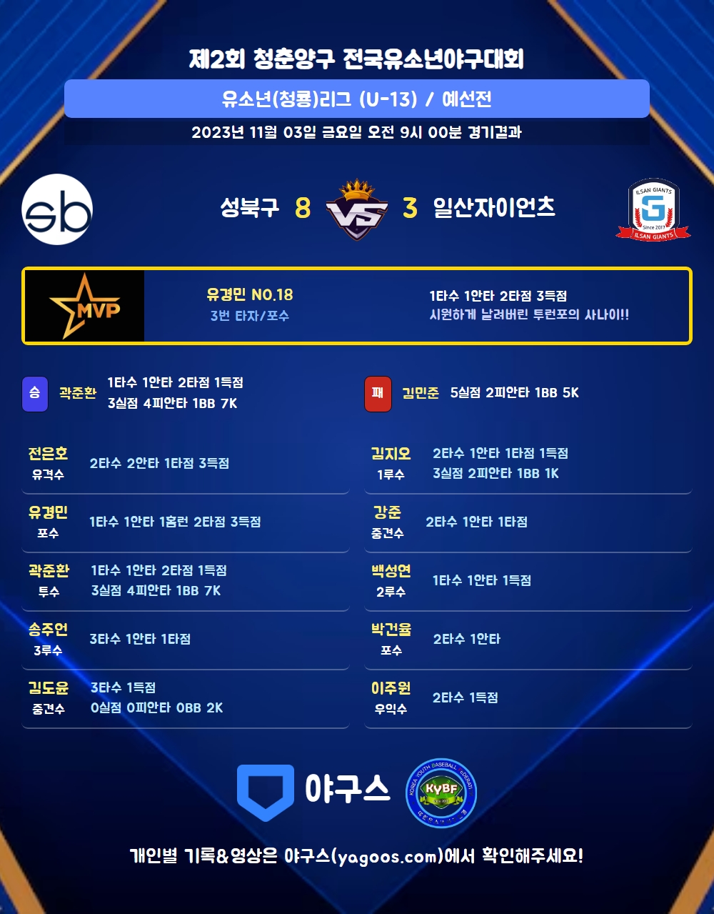 | 일산자이언츠 | 0 | 1 | 2 | 0 | 3 | 4 | 1 | 1 |