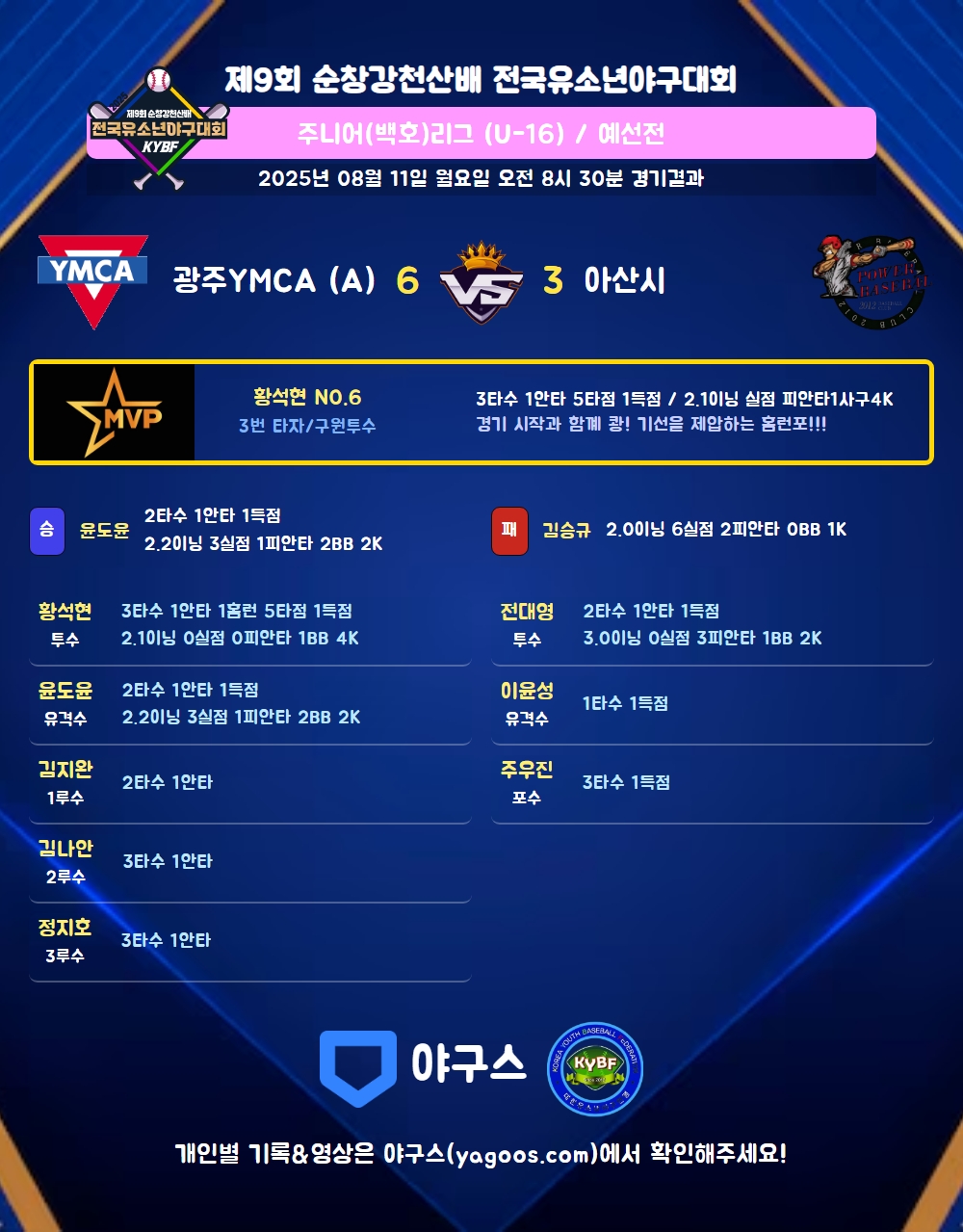 | 광주YMCA (A) | 1 | 5 | 0 | 0 | 0 | 0 | 6 | 5 | 2 | 5 | 6 |