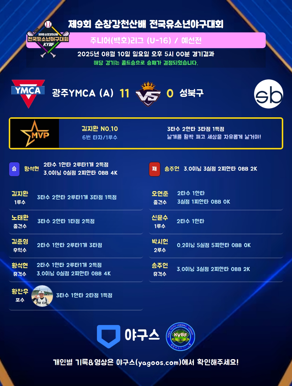 | 2루타 | 김준영(11) 황석현(6) 김지완(10) |