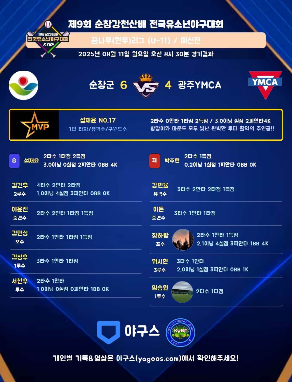 | 2 | 설재윤(17) | 승 | 3.0 | 11 | 11 | 2 | - | - | 4 | 36 | - | - | 0 |