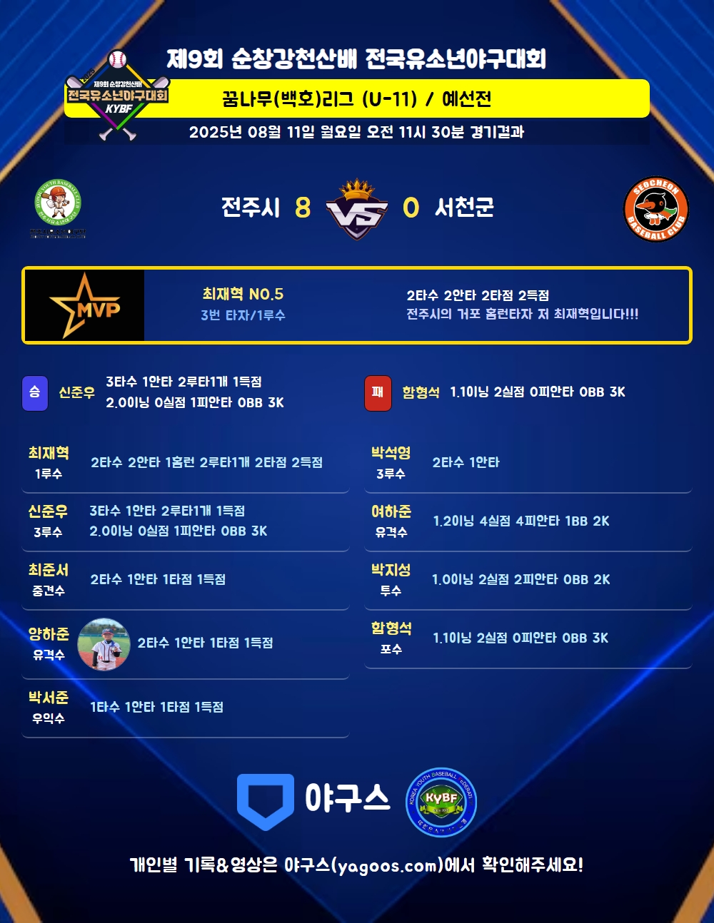 | 9 | 좌 | 김도준(16) | - | 유땅(1타점) | 투땅 | - | - | 2 | 0 | 1 | - | - | - | - | - | 0.000 |