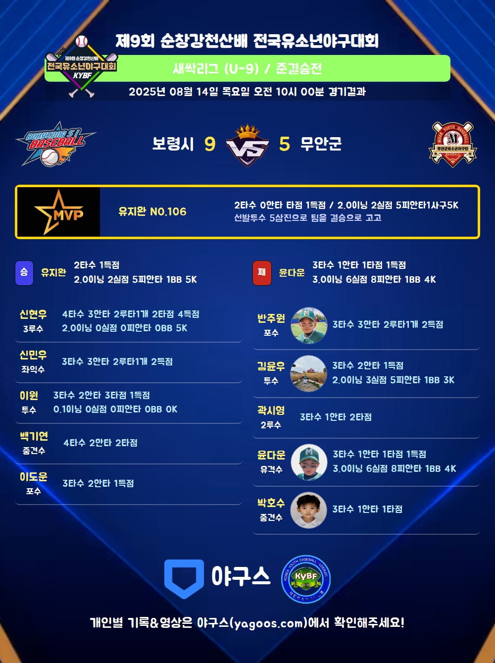 | 1 | 유지완(106) | 승 | 2.0 | 13 | 11 | 5 | - | 2 | 5 | 52 | 2 | 2 | 9.00 |