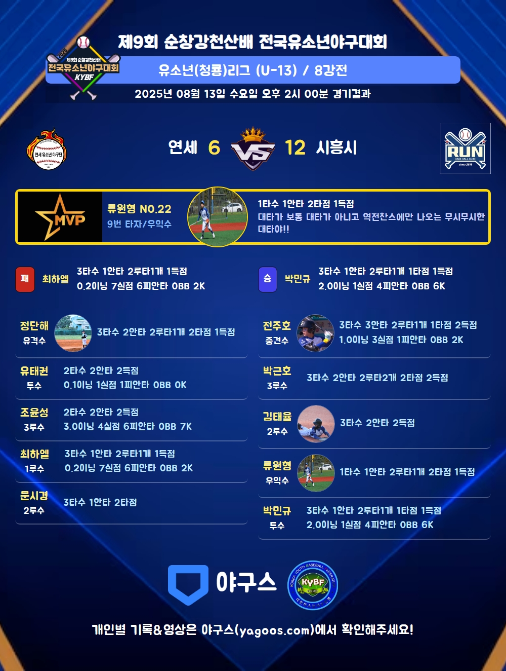 | 2루타 | 정단해(18) 최하엘(43) 박근호(39) 박민규(32) 전주호(54) 김하준(10) 장시윤(27) 류원형(22) |