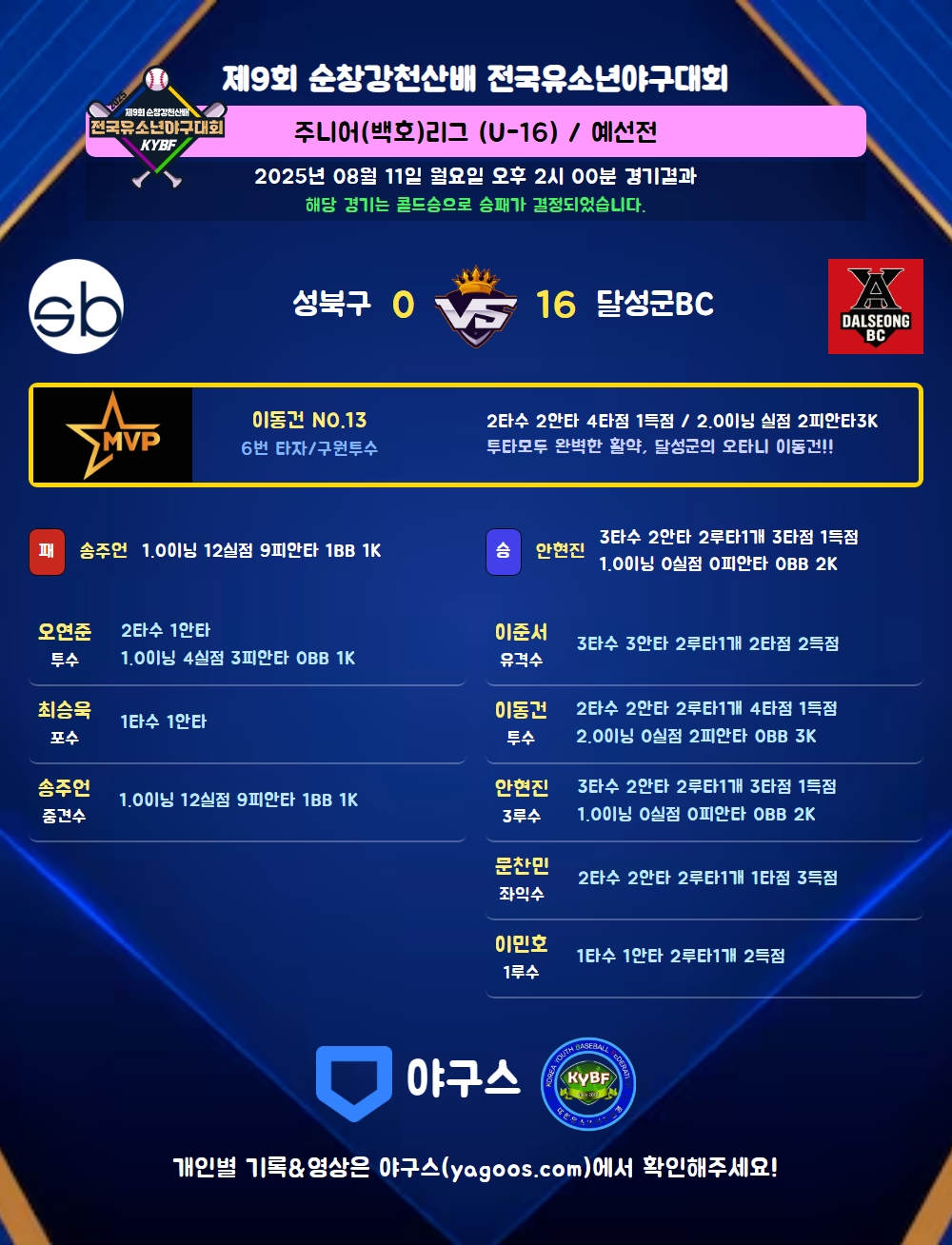 | 2루타 | 문찬민(22) 이민호(10) 이준서(27) 이동건(13) 안현진(11) |