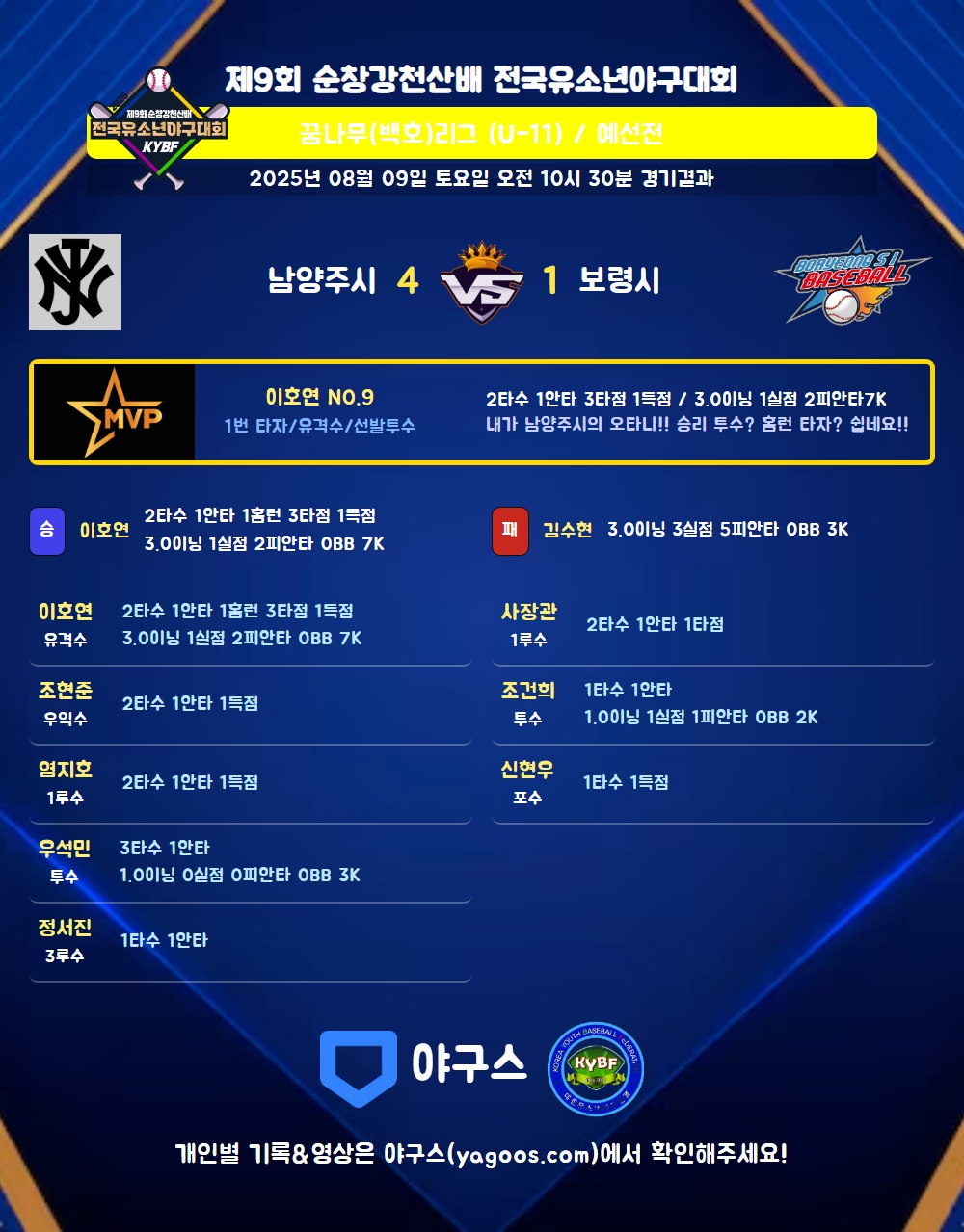 | 1 | 유 | 이호연(9) | 유직 | - | 좌중홈(3타점) | 고의4구 | - | 2 | 1 | 3 | 1 | 1 | - | 1 | - | 0.500 |