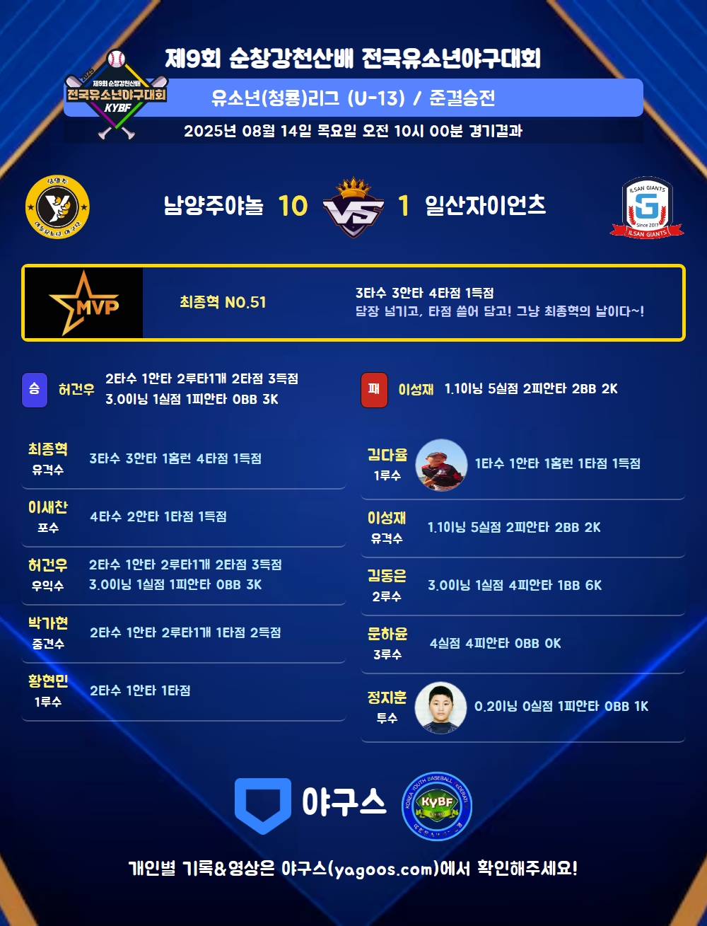 | 1 | 유 | 최종혁(51) | 중월홈(1타점) | 우안(2타점) | - | 사구 | 우안(1타점) | - | 3 | 3 | 4 | 1 | 1 | - | 1 | - | 1.000 |