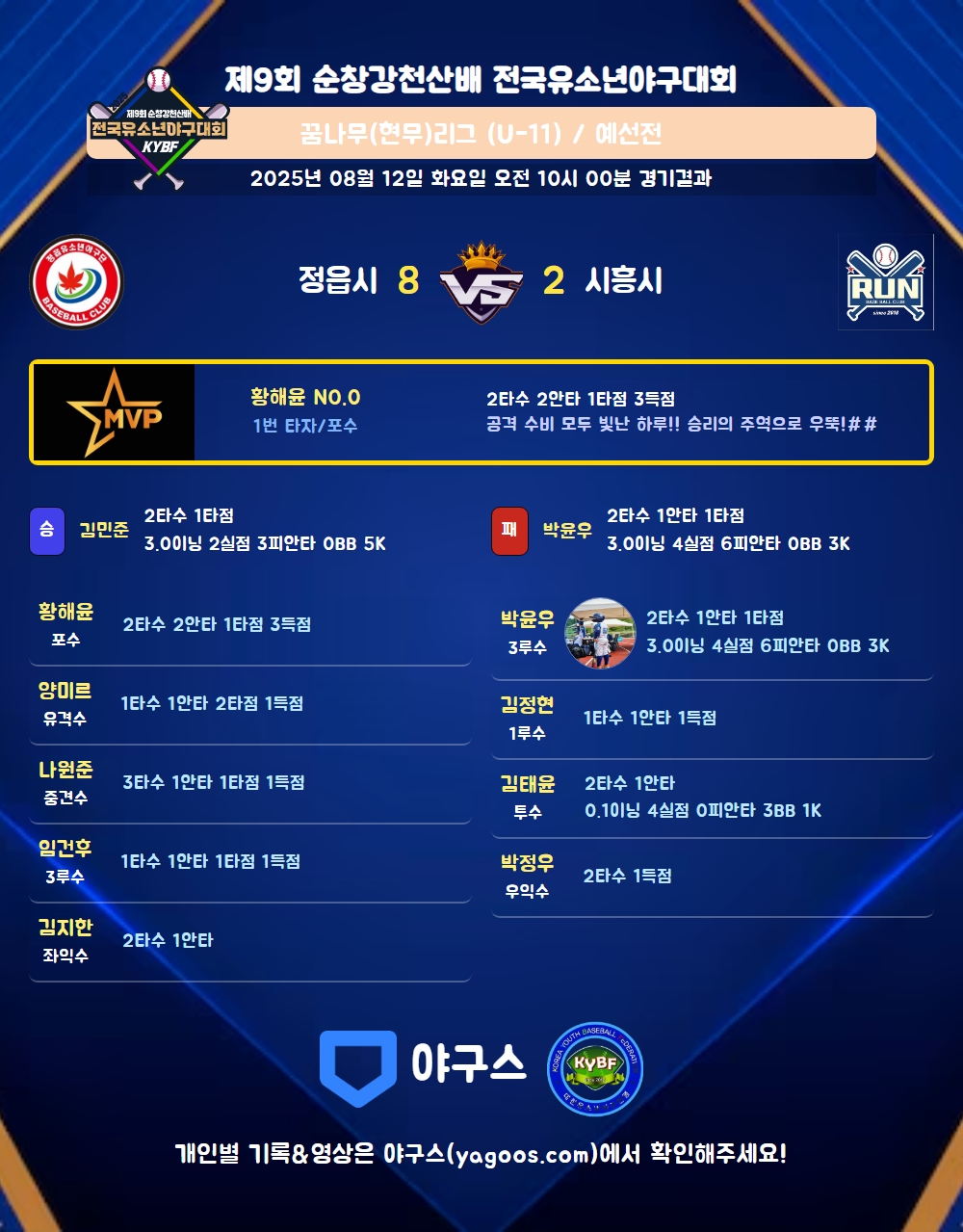 | 3 | 투 | 김민준(13) | 투플 | - | 유땅 | 사구(1타점) | 2 | 0 | 1 | - | - | - | 1 | - | 0.000 |