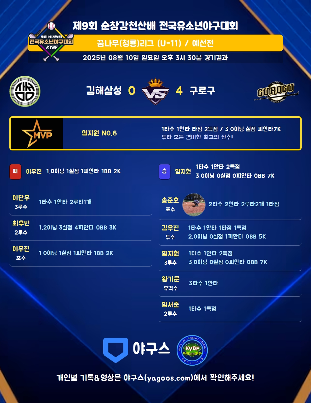 | 9 | 우 | 천예서(2) | - | - | 삼진 | - | - | 1 | 0 | - | - | - | - | - | 1 | 0.000 |