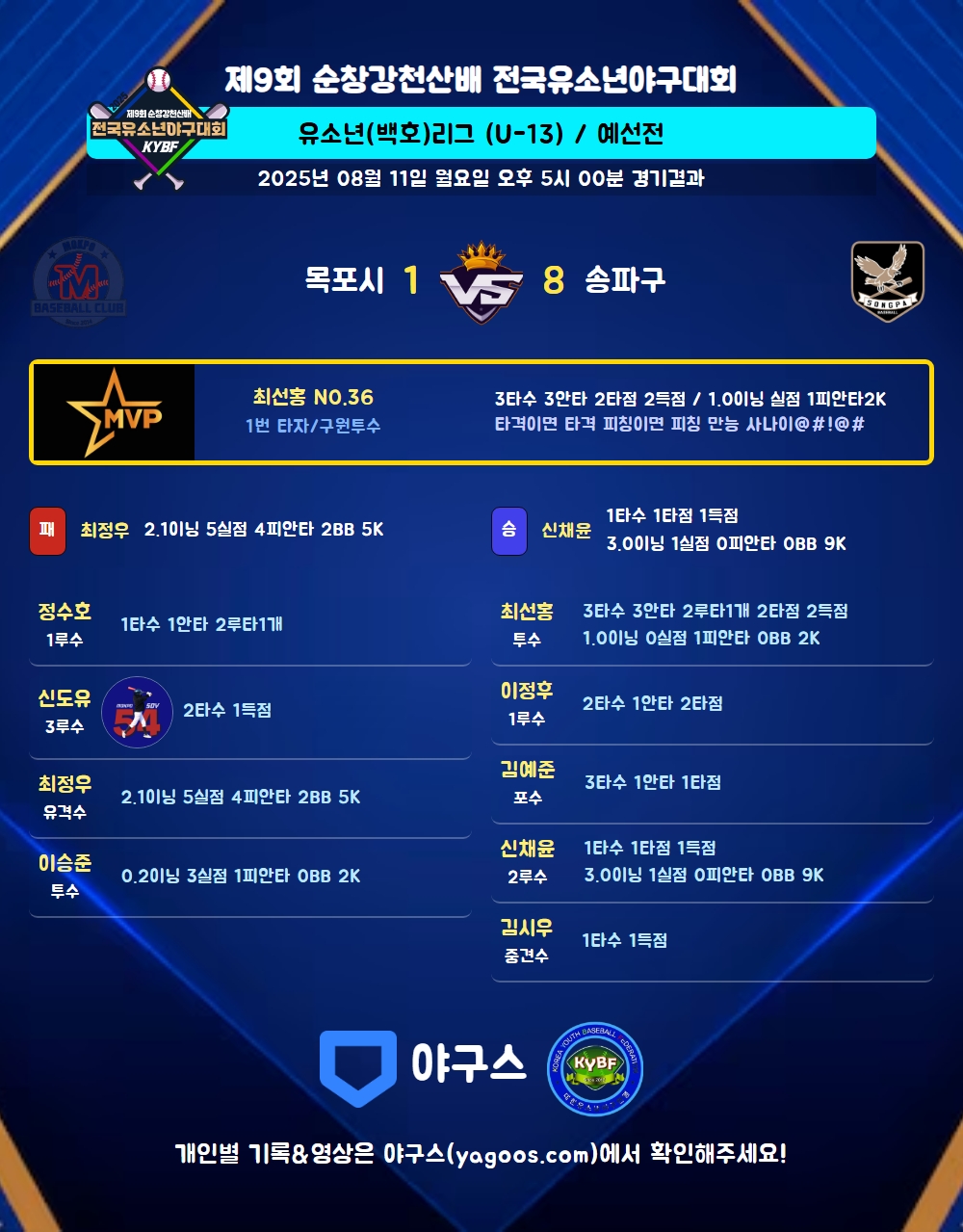 | 8 | 좌 | 윤서준(56) | - | 삼진 | 유야선 | - | 2 | 0 | - | 1 | - | - | - | 1 | 0.000 |