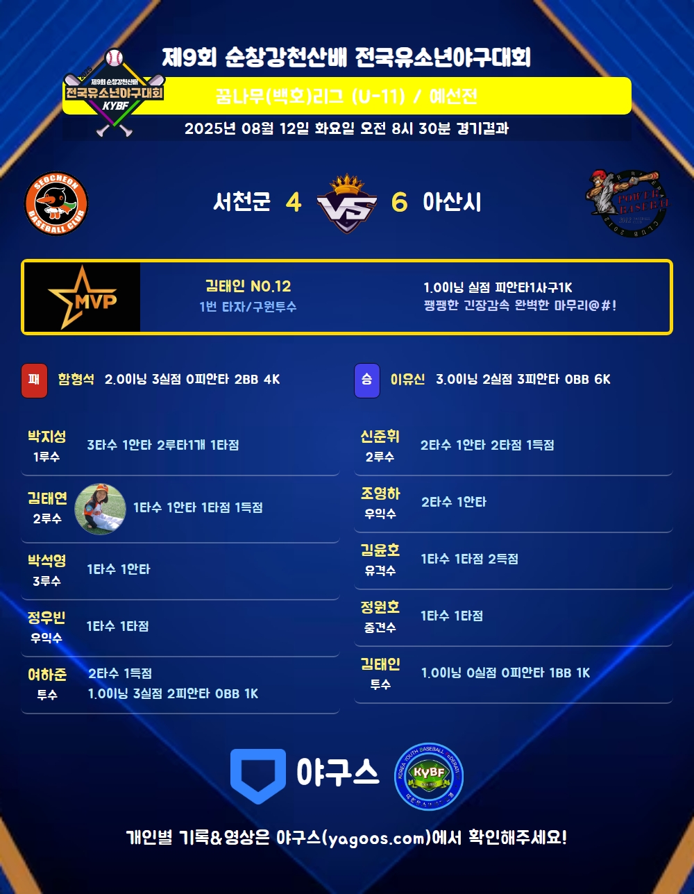 | 3 | 김태인(12) | 세이브 | 1.0 | 5 | 2 | - | - | 3 | 1 | 19 | - | - | 0 |