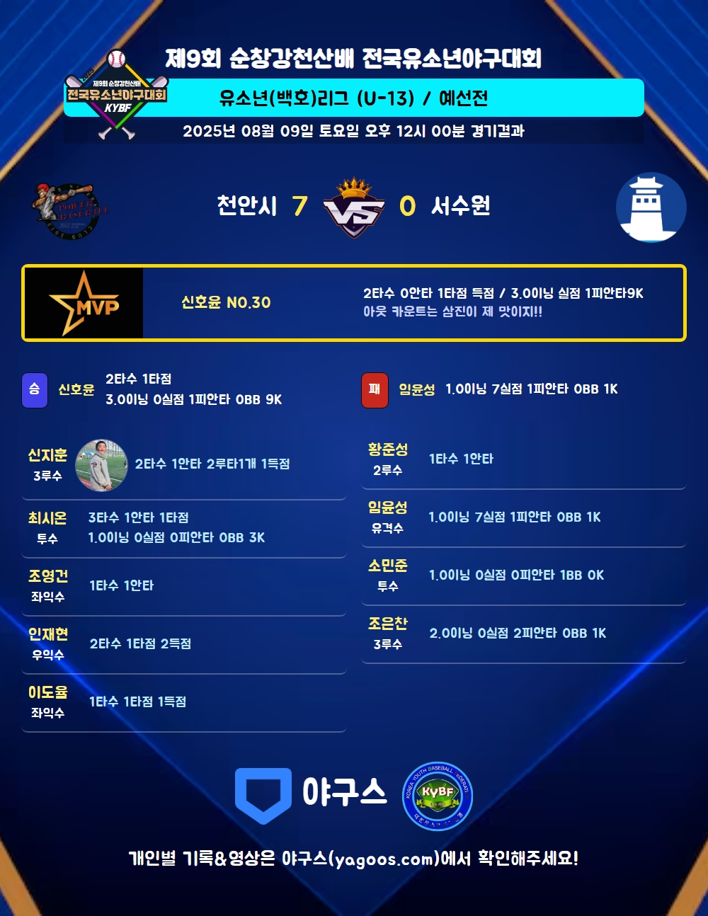 | 1 | 신호윤(30) | 승 | 3.0 | 11 | 10 | 1 | - | 1 | 9 | 48 | - | - | 0 |