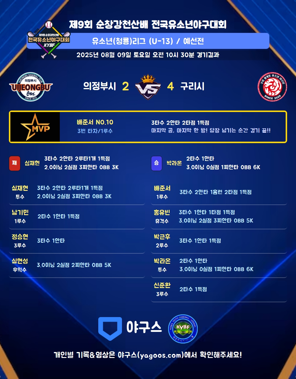 | 2 | 三 | 정승현(9) | 3내안 | - | 2땅 | - | 3땅 | - | 3 | 1 | - | - | - | 1 | - | - | 0.333 |