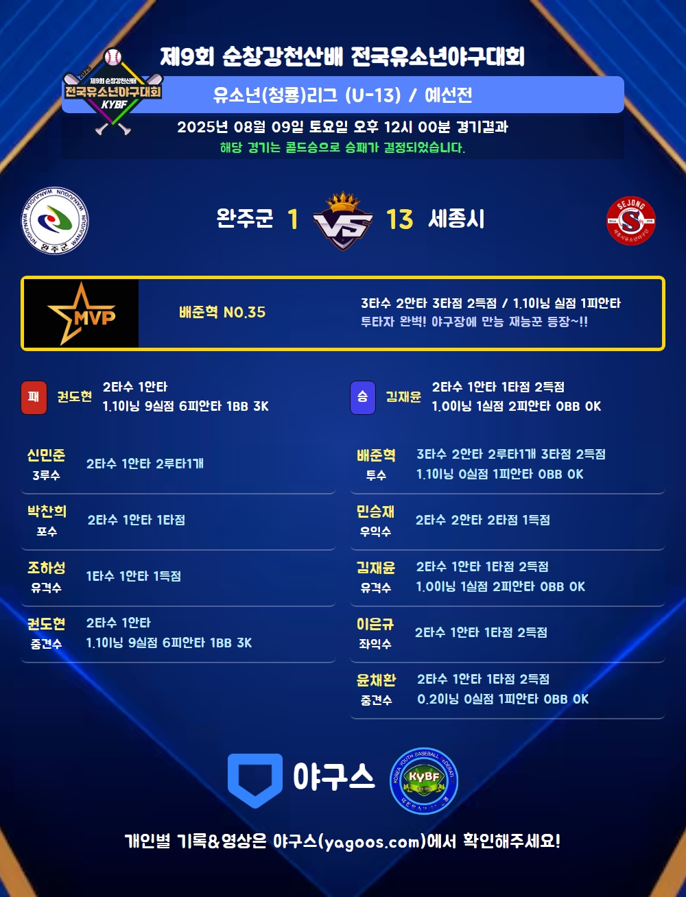 | 1 | 투 | 배준혁(35) | 2땅 | 1내안(1타점)/우선2(2타점) | - | - | - | - | 3 | 2 | 3 | 2 | - | 1 | - | - | 0.667 |
