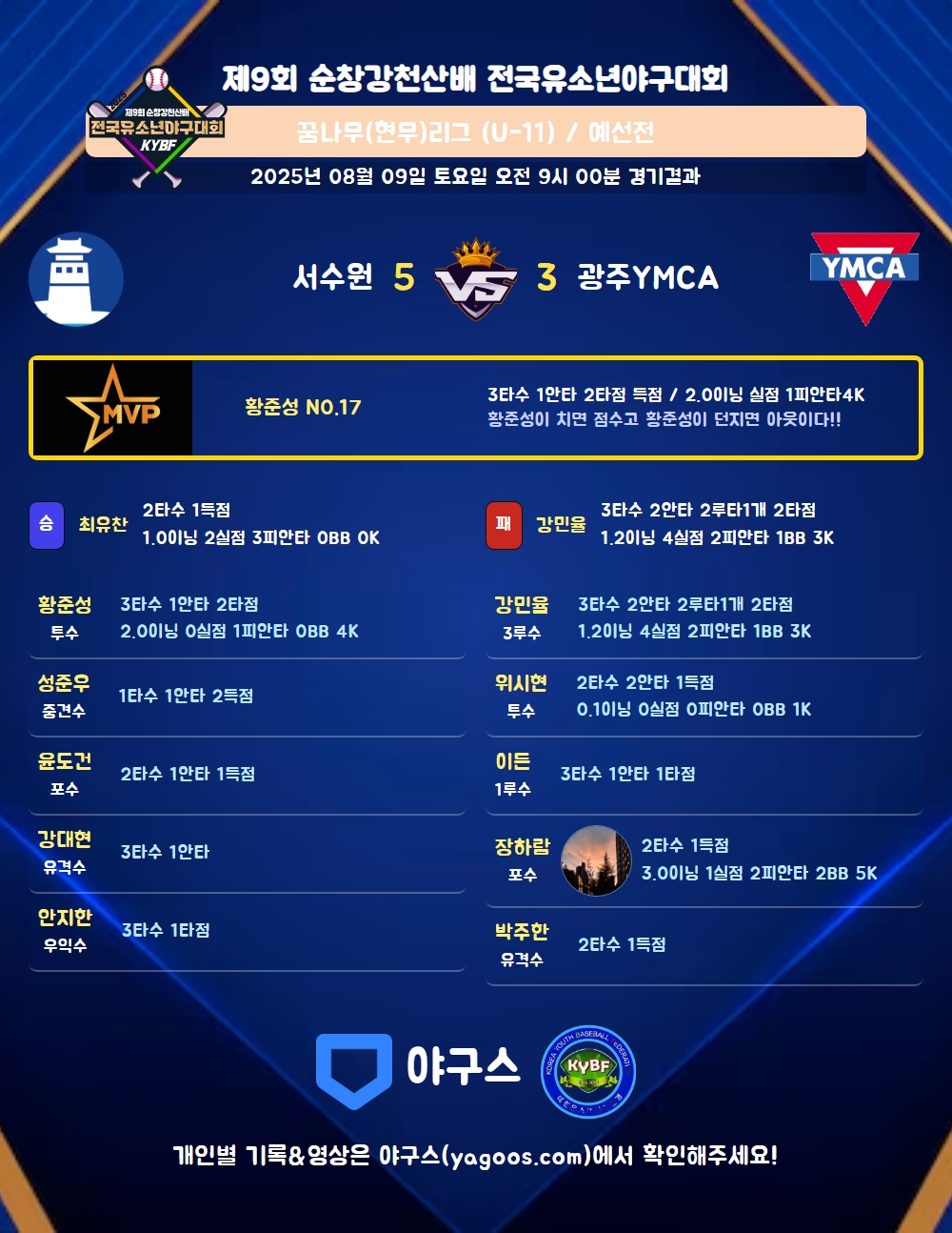 | 광주YMCA | 1 | 0 | 2 | 0 | 0 | 3 | 5 | 1 | 2 | 5 |