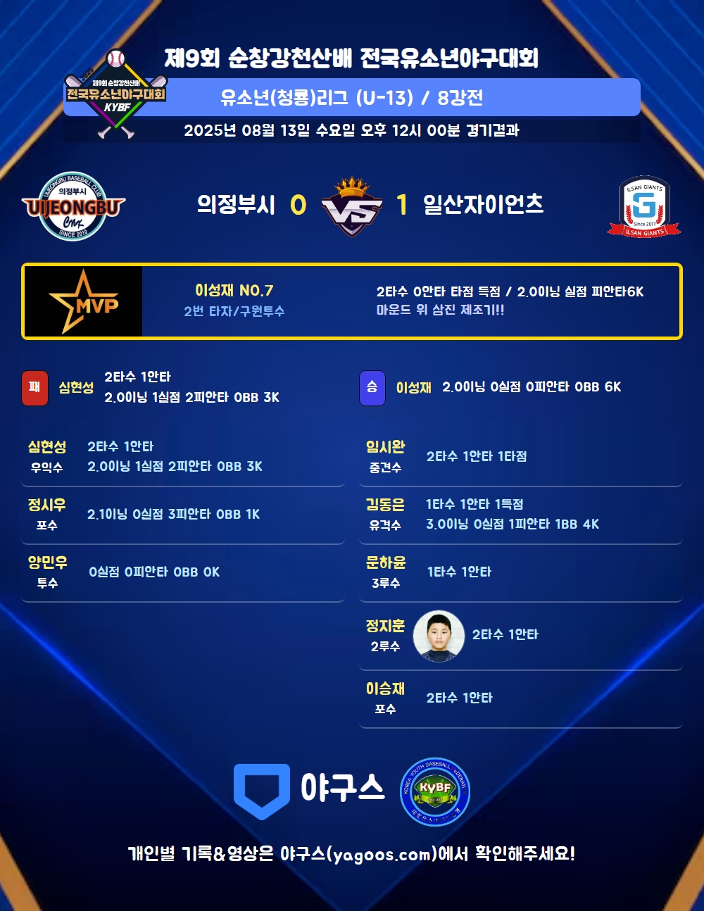 | 일산자이언츠 | 0 | 0 | 0 | 0 | 1 | 1 | 5 | 0 | 9 | 7 |