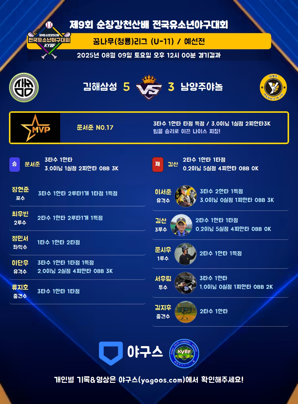 | 김해삼성 | 0 | 0 | 0 | 5 | 0 | 0 | 5 | 8 | 1 | 1 | 5 |