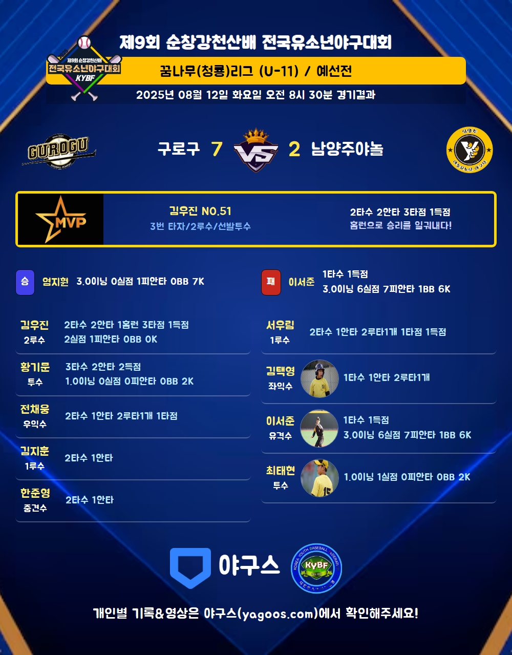 | 7 | 一 | 김지훈(4) | 삼진 | - | 좌안 | - | - | 2 | 1 | - | - | - | - | - | 1 | 0.500 |