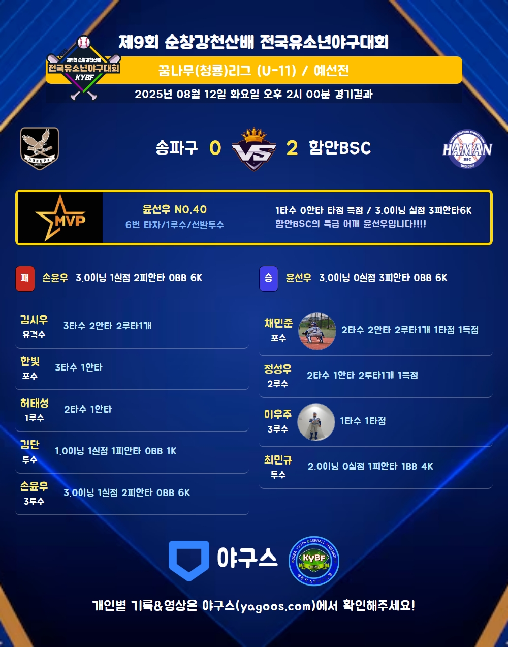 | 함안BSC | 1 | 0 | 0 | 1 | 0 | 2 | 3 | 0 | 1 | 0 |