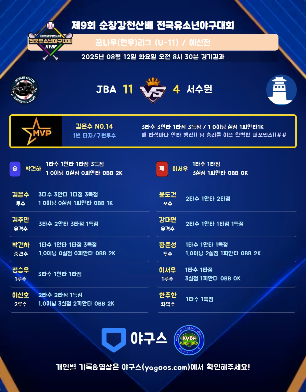 | 4 | 유 | 김주안(8) | 2내안(1타점) | 좌중안(1타점) | 1땅(1타점) | - | 3 | 2 | 3 | 1 | - | - | - | - | 0.667 |