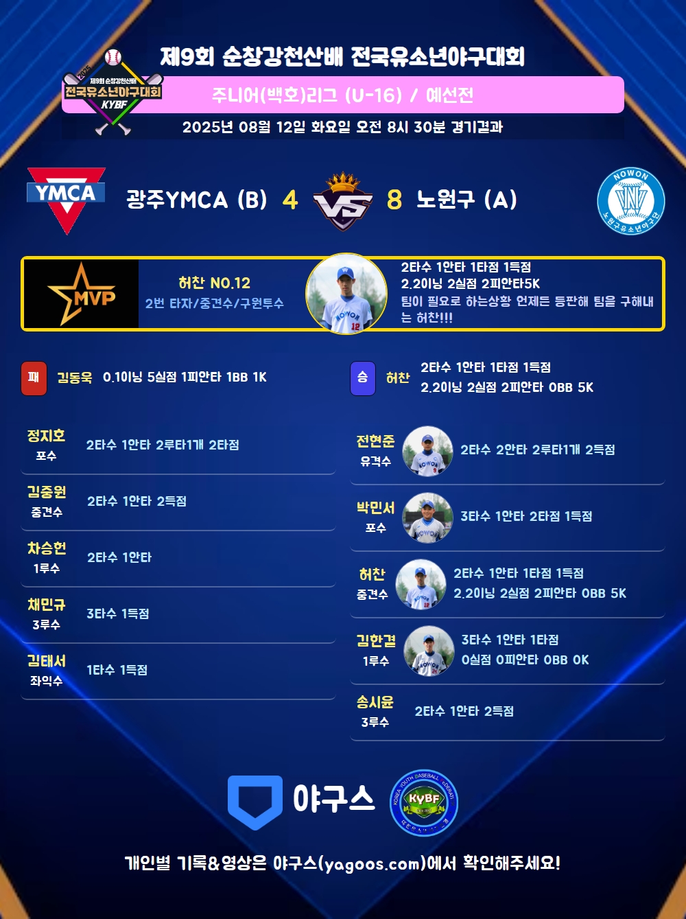 | 4 | 허찬(12) | 승 | 2.2 | 11 | 10 | 2 | - | 1 | 5 | 44 | 2 | 2 | 6.75 |