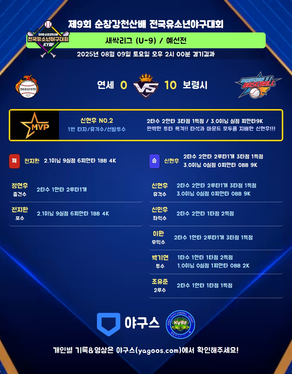 | 2 | 二 | 이예준(9) | 4구 | - | 삼진 | - | - | 1 | 0 | - | - | - | - | 1 | 1 | 0.000 |