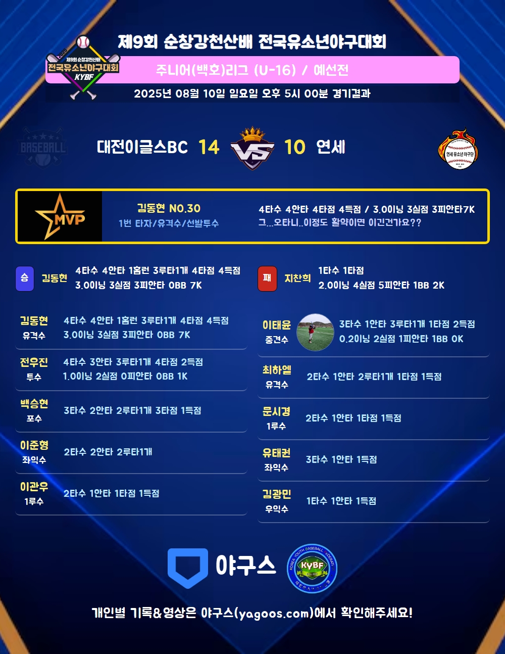 | 3루타 | 김동현(30) 전우진(17) 이태윤(88) |