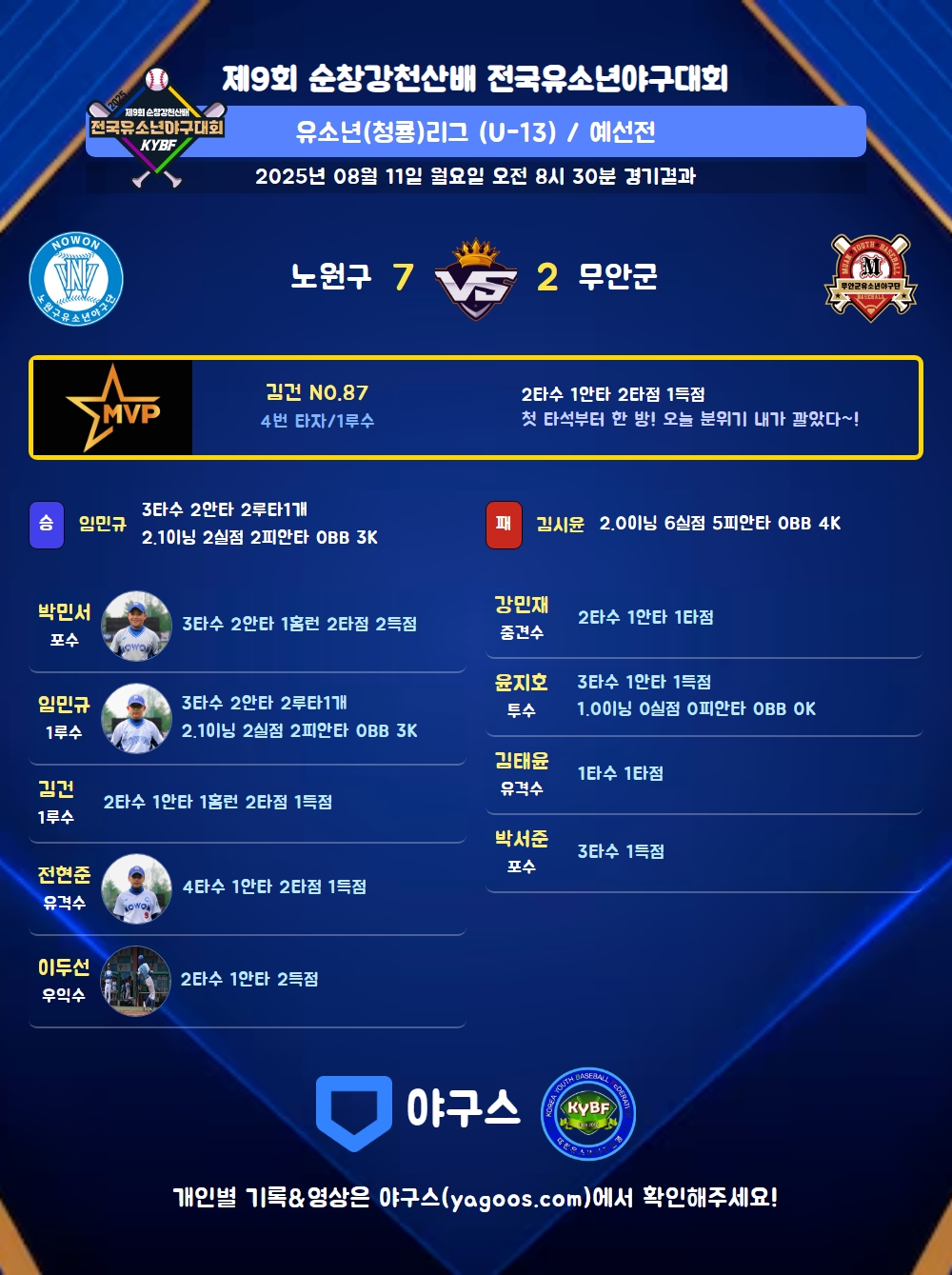 | 홈런 | 박민서(13) 김건(87) |