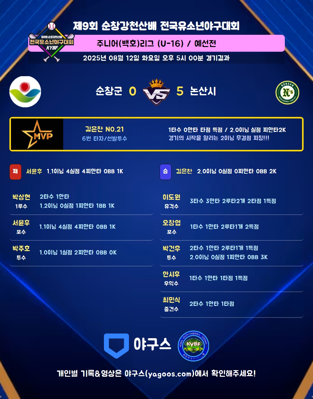 | 2 | 二 | 서지웅(11) | 유플 | 우땅(1타점) | - | - | - | 2 | 0 | 1 | - | - | - | - | - | 0.000 |