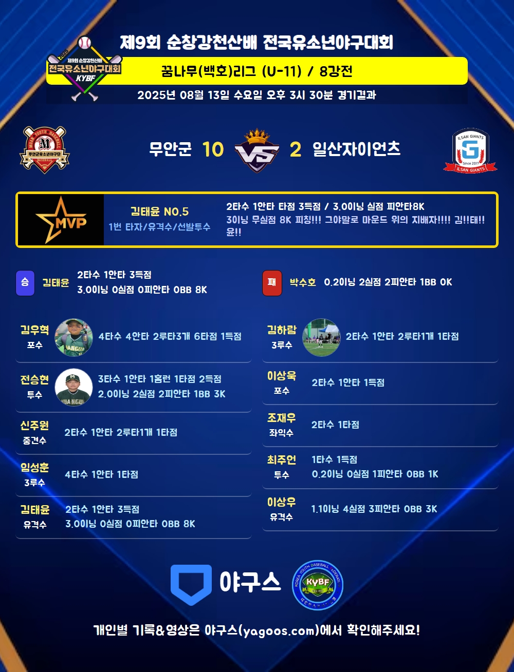 | 1 | 김태윤(5) | 승 | 3.0 | 10 | 9 | - | - | 1 | 8 | 45 | - | - | 0 |