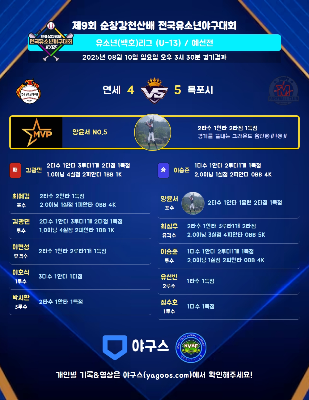| 6 | 포 | 양윤서(5) | 유플 | - | 중전G홈(2타점) | - | 2 | 1 | 2 | 1 | 1 | - | - | - | 0.500 |