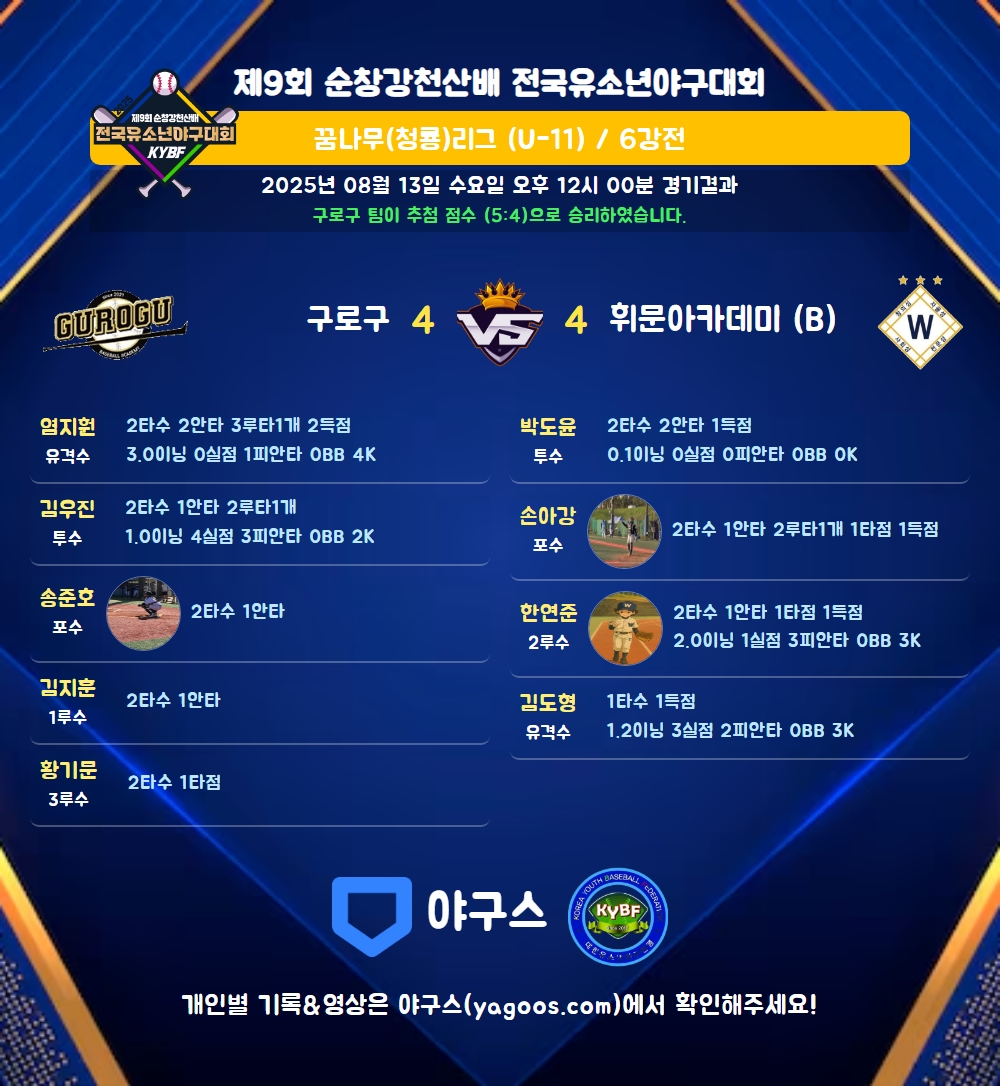 | 5 | 二 | 한연준(17) | - | 유땅 | - | 중안(1타점) | - | 2 | 1 | 1 | 1 | - | 3 | - | - | 0.500 |