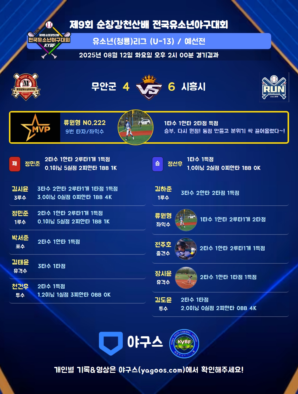 | 9 | 좌 | 류원형(222) | - | - | - | 좌월2(2타점) | - | - | 1 | 1 | 2 | - | - | - | - | - | 1.000 |