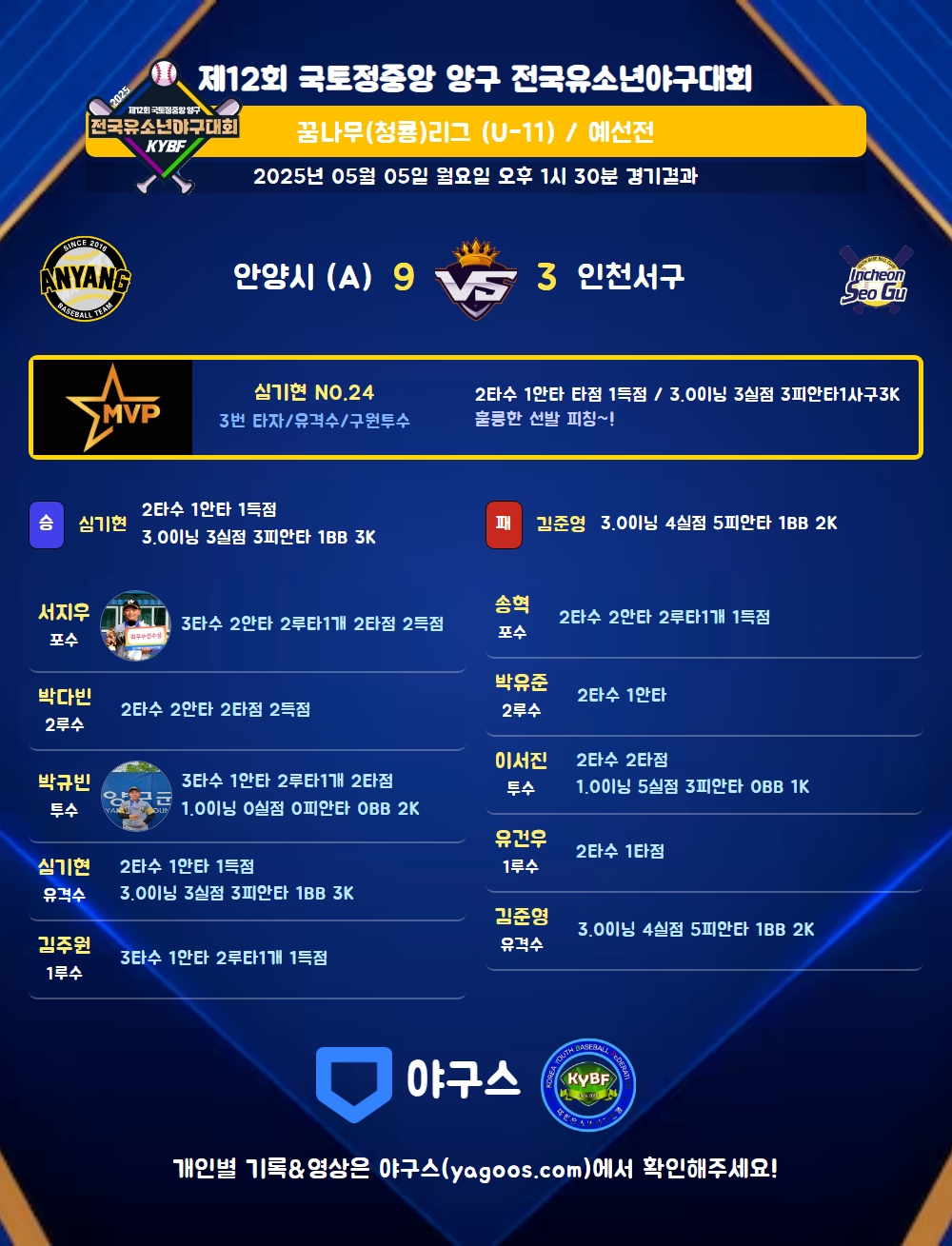 | 1 | 심기현(24) | 승 | 3.0 | 14 | 12 | 3 | - | 2 | 3 | 54 | 3 | 3 | 9.00 |