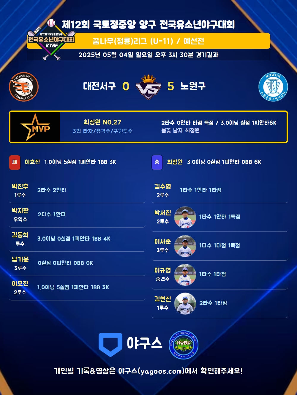 | 5 | 유 | 배이준(7) | - | 포땅 | - | - | 삼진 | - | 2 | 0 | - | - | - | - | - | 1 | 0.000 |