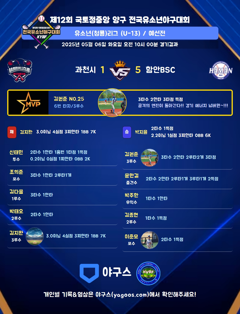 | 함안BSC | 3 | 0 | 1 | 1 | 0 | 0 | 5 | 5 | 0 | 5 | 4 |