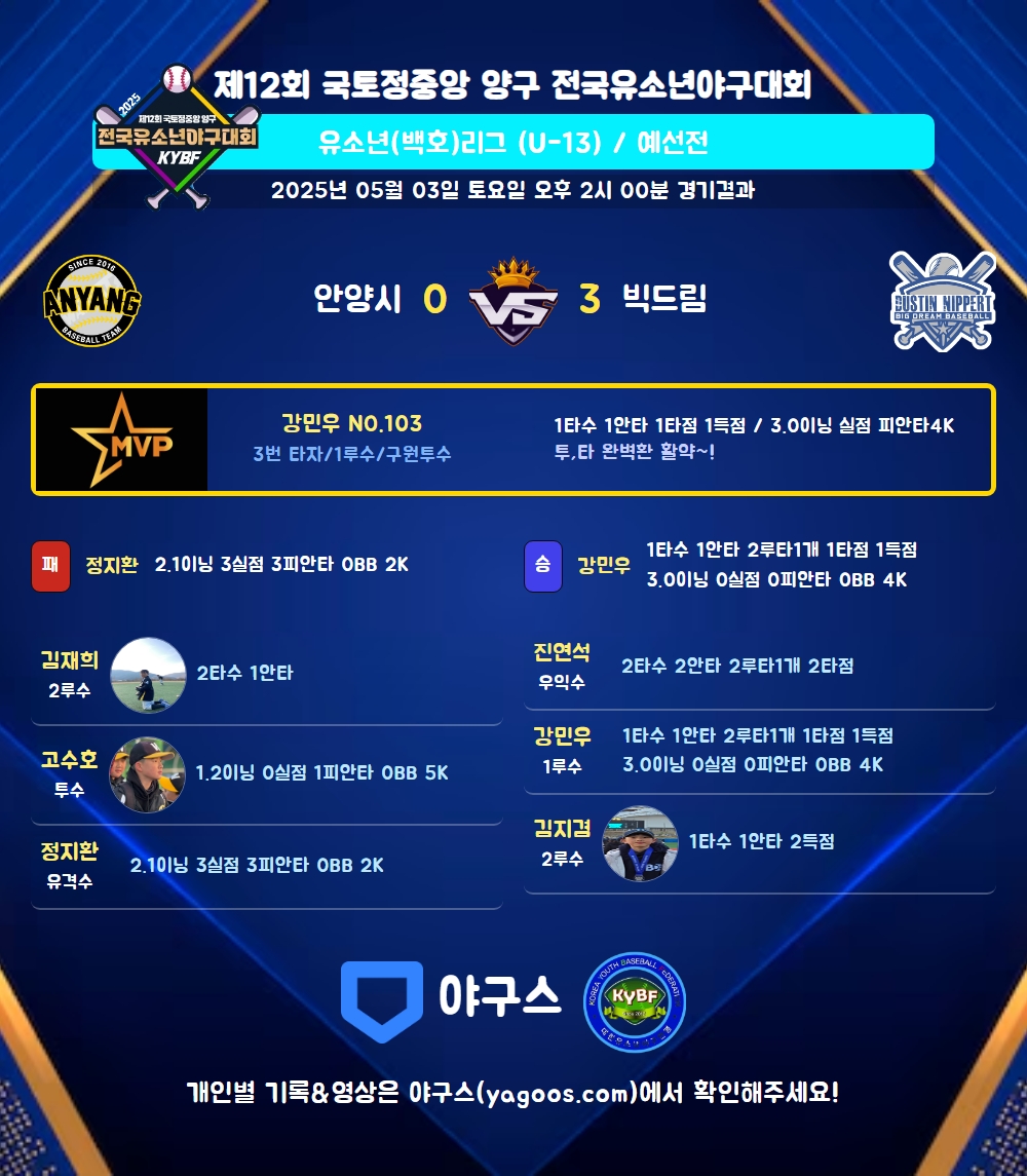| 3 | 一 | 강민우(103) | 중전2(1타점) | - | 4구 | - | - | - | 1 | 1 | 1 | 1 | - | - | 1 | - | 1.000 |