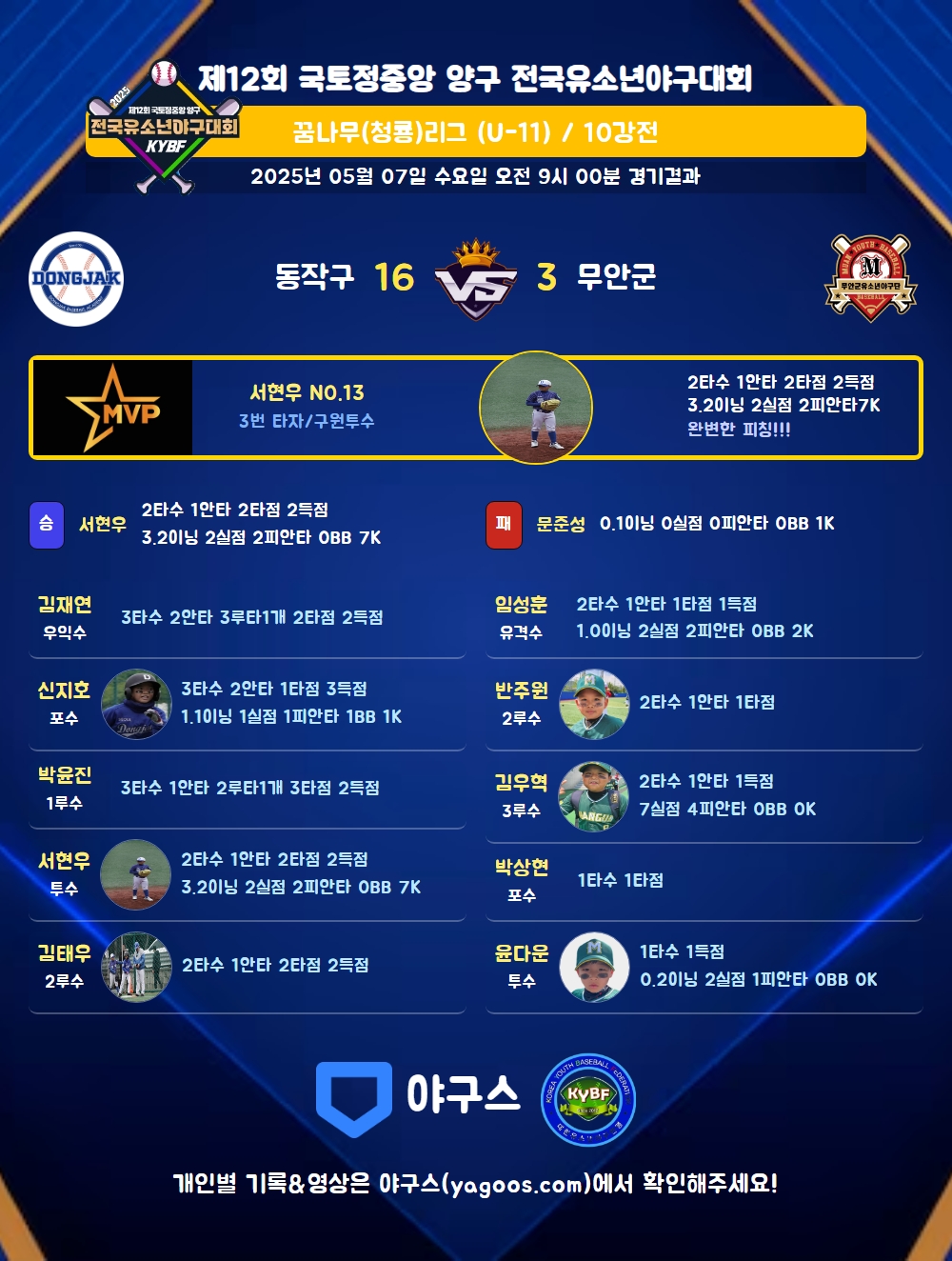 | 2 | 서현우(13) | 승 | 3.2 | 15 | 14 | 2 | - | 1 | 7 | 59 | 2 | 2 | 4.91 |