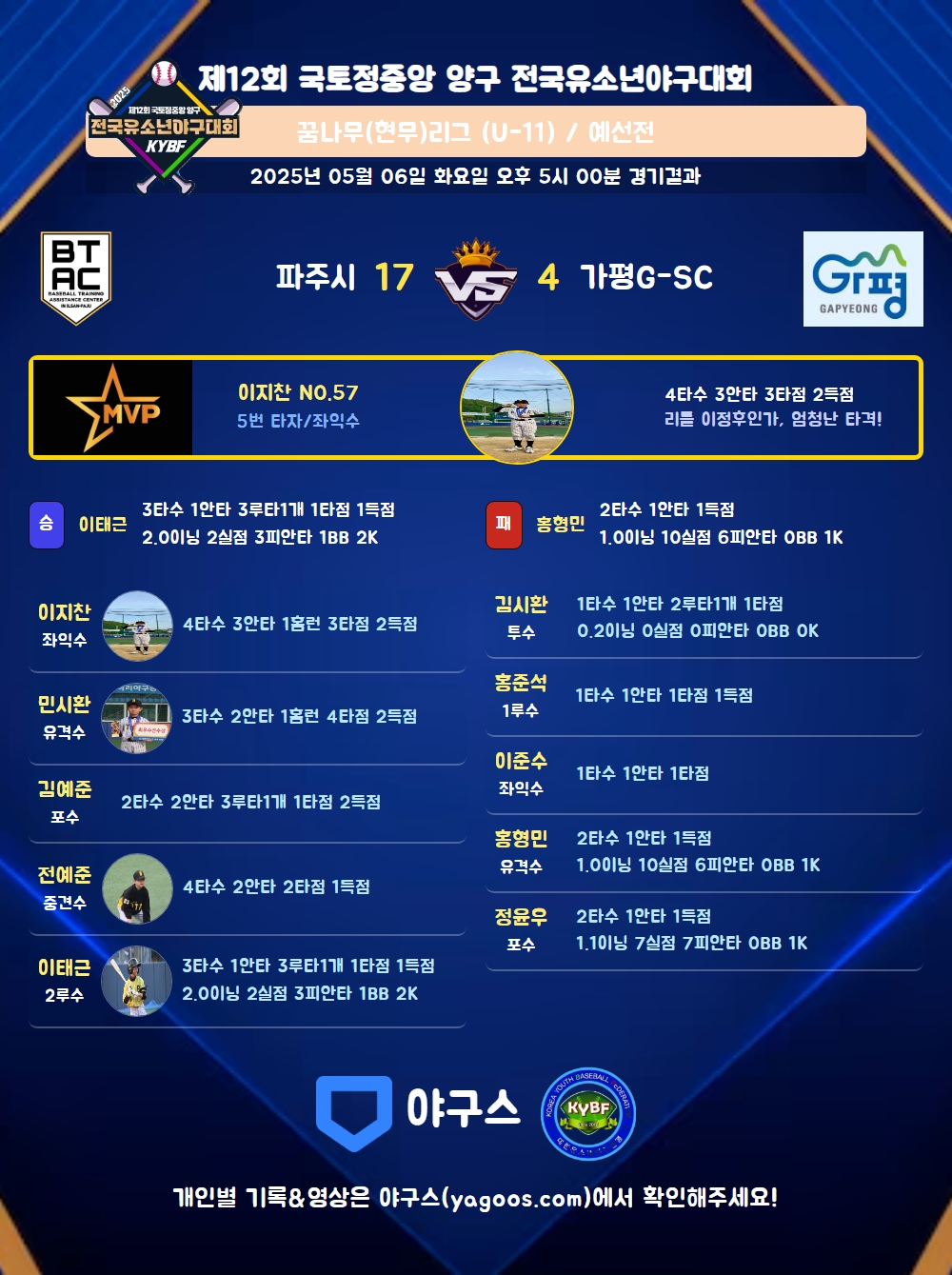 | 4 | 중 | 전예준(23) | 유실(1타점)/좌안 | - | 2땅/좌안(1타점) | - | - | - | 4 | 2 | 2 | 1 | - | - | - | - | 0.500 |