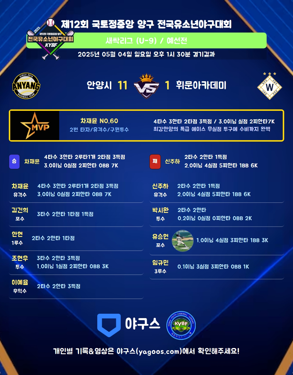 | 1 | 차재윤(60) | 승 | 3.0 | 11 | 11 | 2 | - | - | 7 | 39 | - | - | 0 |