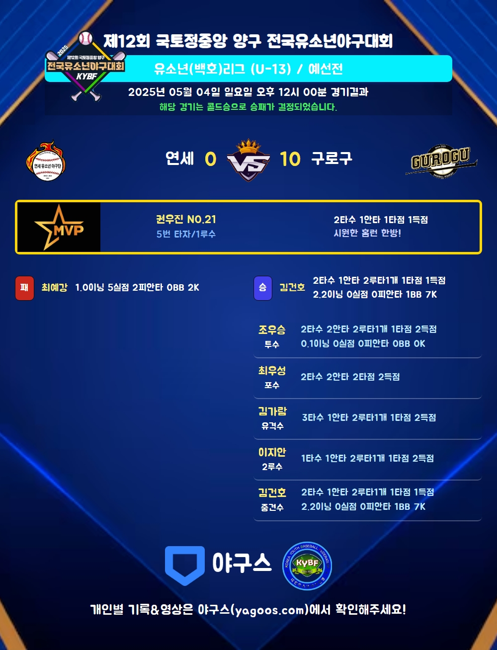 | 1 | 김건호(13) | 승 | 2.2 | 9 | 8 | - | - | 1 | 7 | 38 | - | - | 0 |