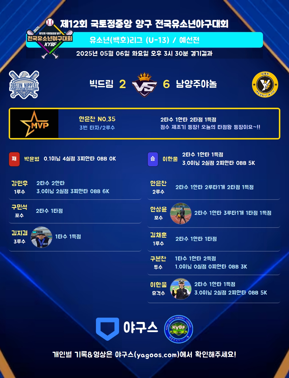 | 3 | 二 | 안은찬(35) | 좌중2(2타점) | 삼진 | - | - | - | - | 2 | 1 | 2 | 1 | - | 1 | - | 1 | 0.500 |