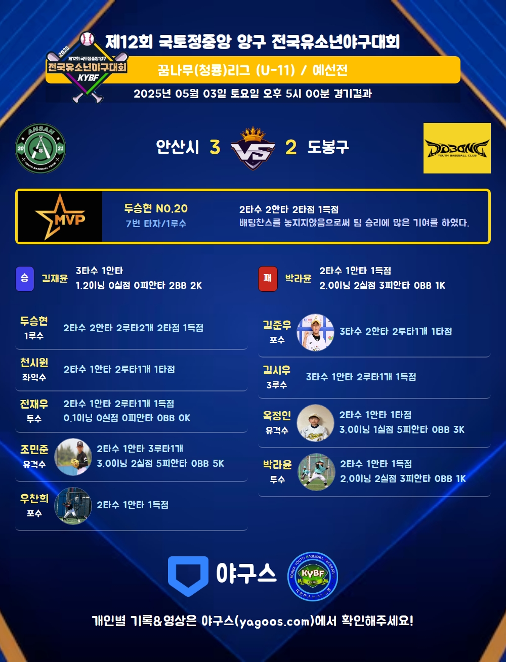 | 2루타 | 전재우(57) 두승현(20) 천시원(17) 김시우(44) 김준우(18) |