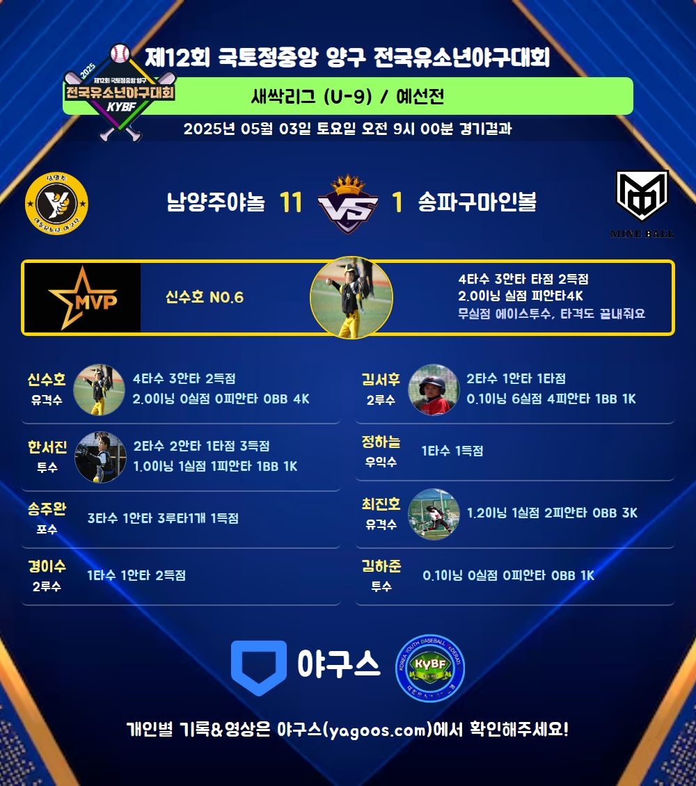 | 남양주야놀 | 6 | 1 | 4 | 0 | 0 | 0 | 11 | 7 | 0 | 12 | 8 |