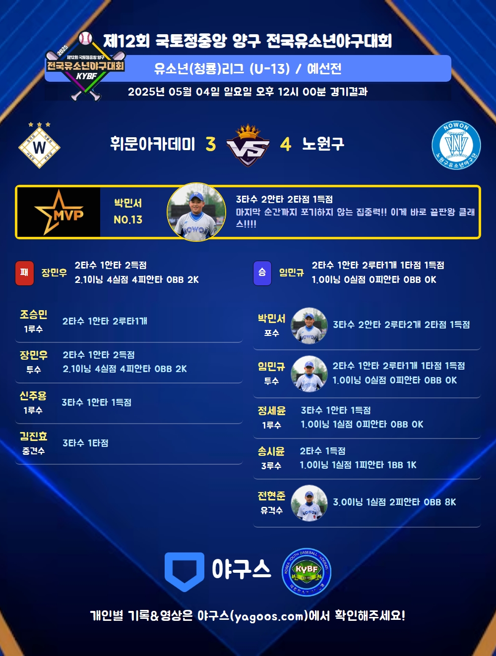 | 2루타 | 조승민(24) 박민서(13) 임민규(44) |