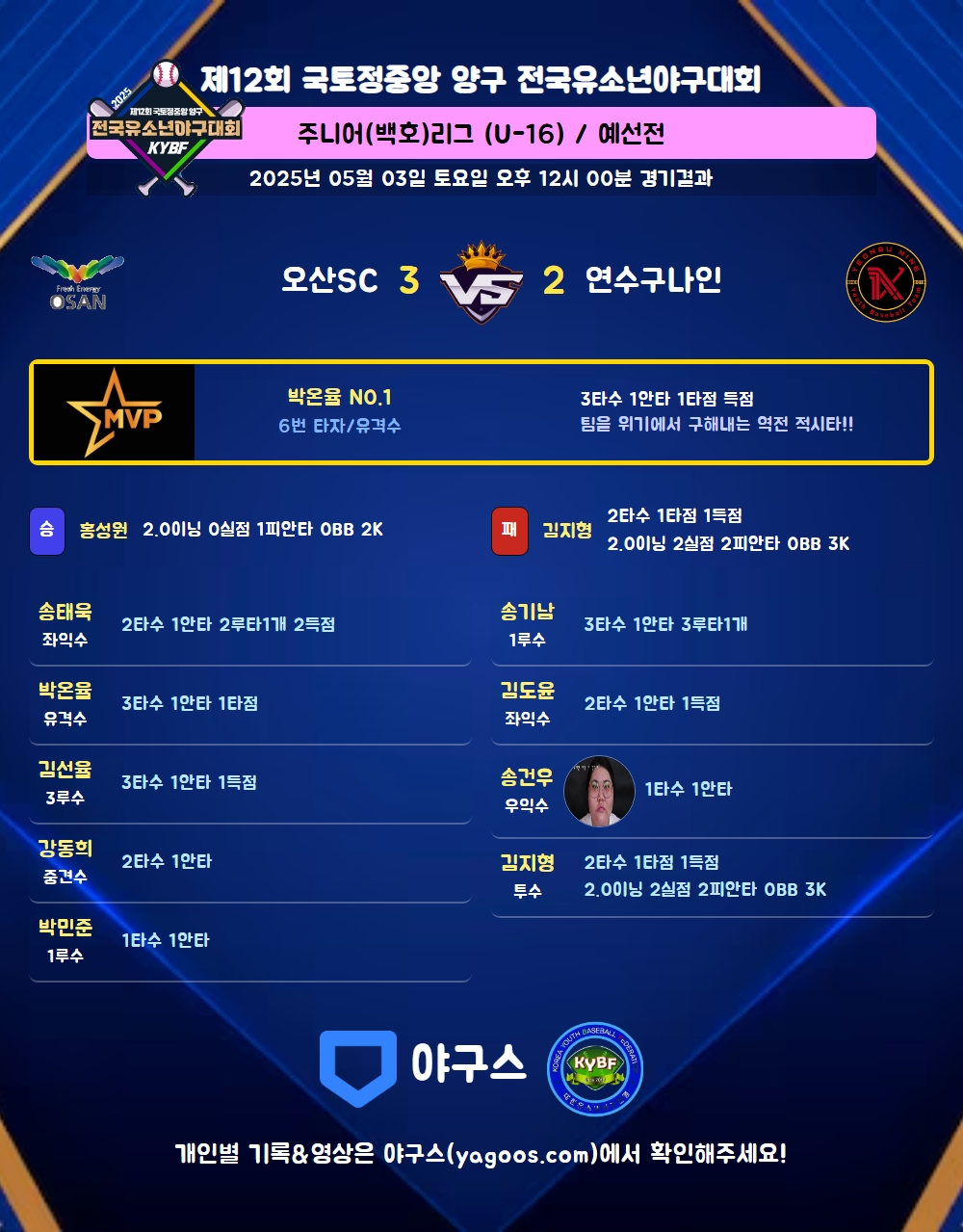 | 3 | 좌 | 송태욱(16) | 삼진 | - | 좌월2 | - | 4구 | - | 2 | 1 | - | 2 | - | - | 1 | 1 | 0.500 |